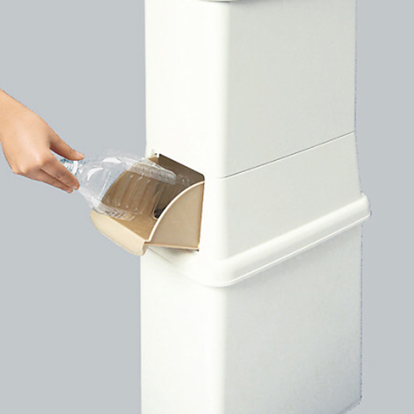 ■上部容器には、生ゴミなど燃えるゴミを。下部には、ビン、缶などの資源ゴミを。上のフタは、ワンタッチで開けられます。上下の容器には、ポリ袋を押さえるハンドル付。
