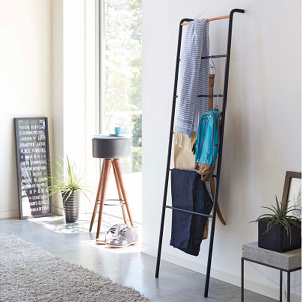 洋服の一時掛けにも便利なラダーハンガー。S字フックを使用すればベルトなどの小物も収納できます。スリムな立て掛け設計なので置く場所を選びません。