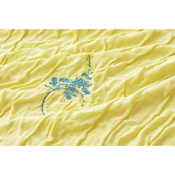 春を告げる花ミモザのモチーフのプリントのマイクロファイバー生地と、もこふあやわらかなニット生地のリバーシブルの肌布団です。
