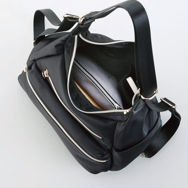 内容:開閉=ファスナーポケット、正面せり出し部=ファスナーポケット、正面=ファスナーポケット、サイド=ペットボトルポケット、本体背側=オープンポケット、本体内部前側=ファスナーポケット、本体内部背側=モバイルポケット