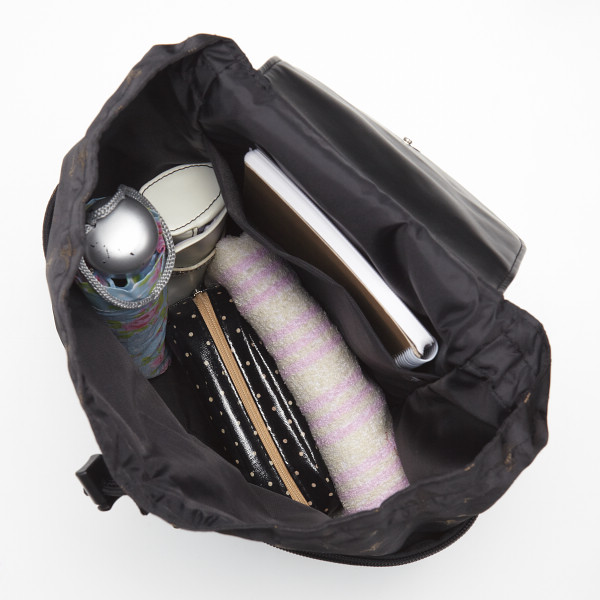 内容:前面=ファスナーポケット×2、オープンポケット×2・背面=ファスナーポケット×1・内側=オープンポケット×1肩紐着脱不可、長さ調節可開閉=かぶせマグネットホック内巾着式