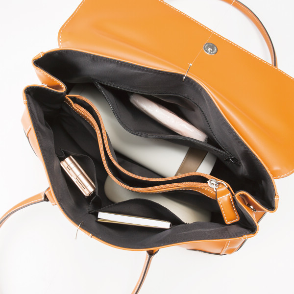 内容:内側=仕切りファスナーポケット×1、ファスナーポケット×1、オープンポケット×2開閉=カブセマグネットホック式