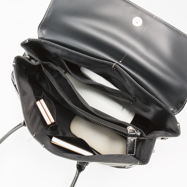 内容:内側=仕切りファスナーポケット×1、ファスナーポケット×1、オープンポケット×2開閉=カブセマグネットホック式