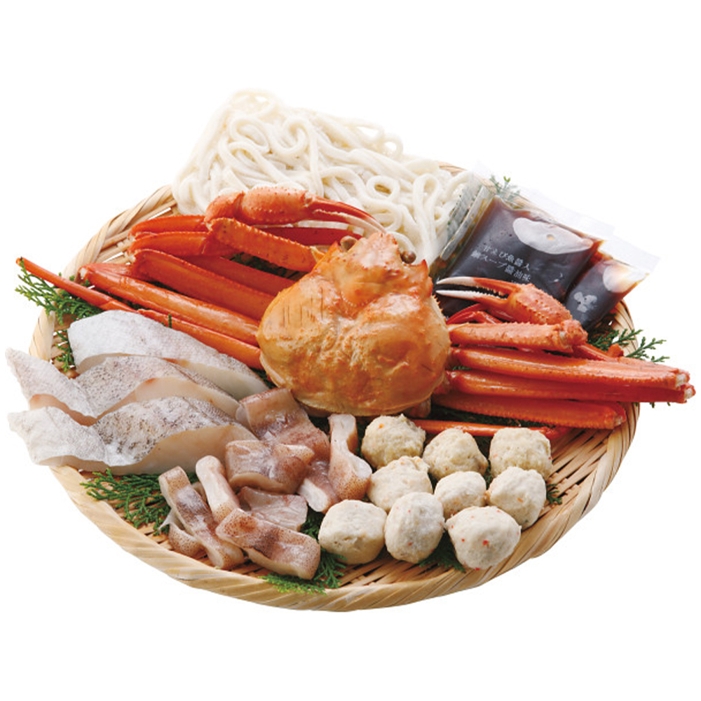 内容:ボイル紅ズワイガニ(姿)380g(紅ズワイガニ:北海道産)、助宗鱈切身40g(スケソウダラ:北海道産)×3切(するめいかカット100g、かに入りつみれ3個、えび入つみれ3個、とりごぼうつみれ3個、うどん250g(国内製造)、えび魚醤油入たれ50ml×2袋