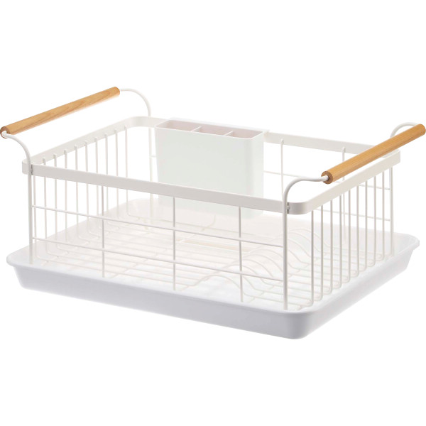 大容量の洗い物をすっきり干せるトレイ付きの水切りラック。持ち手に布巾を干すことができます。菜箸・カトラリー・調理道具などを分別できる着脱ポケット付き。