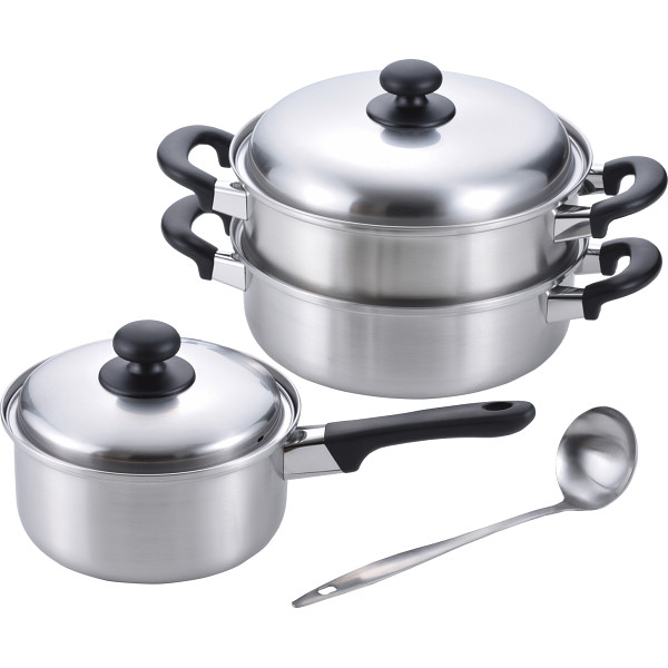 内容:片手鍋18cm=容量約2.4l(深さ約9.4cm)、二段蒸し器24cm=容量約4l(深さ約8.4cm)、お玉×各1ガスコンロ可、100・200V電磁調理器対応