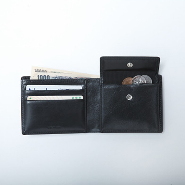 内容:札入×2、カード入×4、ポケット×3、ホック式小銭入×1開閉=二つ折り式
