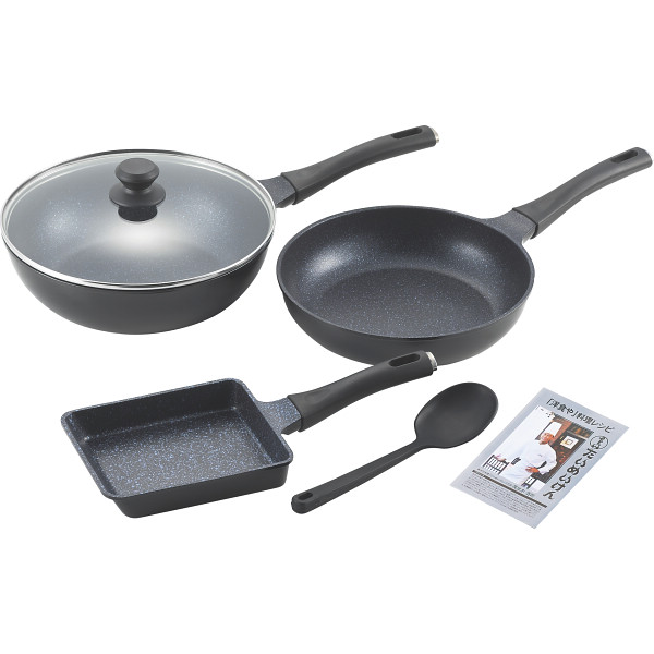 内容:フライパン26cm=深さ約5.7cm、玉子焼=焼き面サイズ約15×16cm(深さ約3.2cm)、蓋付炒め鍋28cm深さ約7.8cmシリコンスプーン・ミニレシピ付ガスコンロ可、100・200V電磁調理器対応