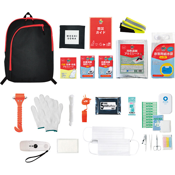 内容:モシソナデイバッグ・レインカバー・4層!防寒防風アルミシート・軍手・ロープ・笛・冷熱遮断アルミシート・スマホ対応ダイナモFMラジオLEDライト・非常用給水袋3l・防災ガイド・5年保証超ウエットティッシュ20枚入・絆創膏5枚・綿棒10P・コットンパフ3・ワンタッチ包帯・爪切り・毛抜き・ハサミ・ポケットティッシュ・除菌ジェル1P・緊急脱出ハンマー・反射安全タスキ×各1、抗菌消臭簡易トイレ1回分・マスク1枚入り×各2