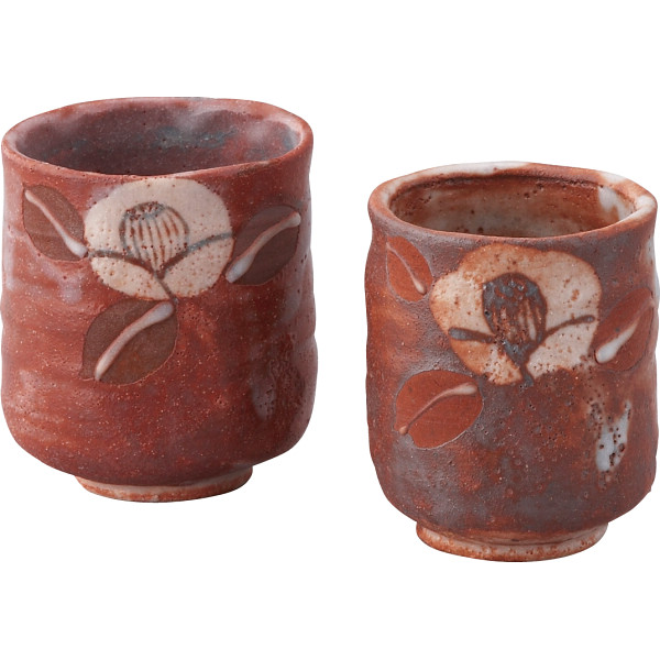 美濃焼の風土の元伝統技法のもとで醸し出された赤志野の手描きの椿の文様が素敵な組湯呑です。