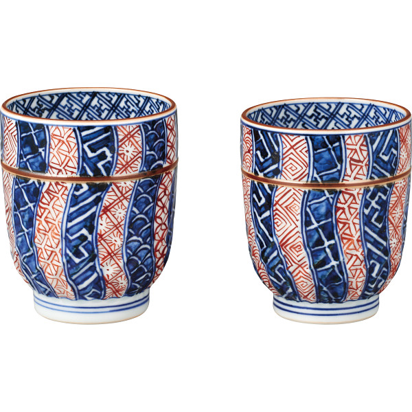 染付と赤絵を交互に縦捻じりに祥瑞紋様を一本一本、精緻な線が手描きで描いています。染付の藍色の間に赤絵の紋様が入っていますので、華麗な中にも上品な落ち着きがあります。素地に彫が施してあり、重厚感を増しています。