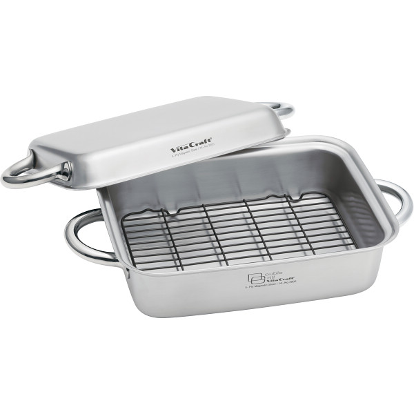 ステンレスとアルミニウムの全面5層構造。無水調理・無油調理・蒸し料理・オーブン調理・余熱調理など様々な使い方ができる四角いお鍋です。浅グリル・深グリルどちらも本体・フタとしても使え、これまでにない使いやすさを実現しました。専用ガラス蓋が付いた特別セット。
