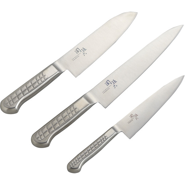 オールステンレスのペティ150mm、三徳170mm、牛刀210mmのセット。衛生的でスマートなデザインのオールステンレス包丁。