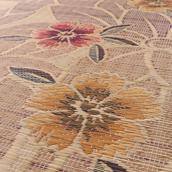 大きな花柄(なでしこ)の日本製い草ラグです。裏に日本製の不織布が付いていますのでクッション性があります。滑りにくい商品です。サイズは191×191cm(約2.4畳)です。