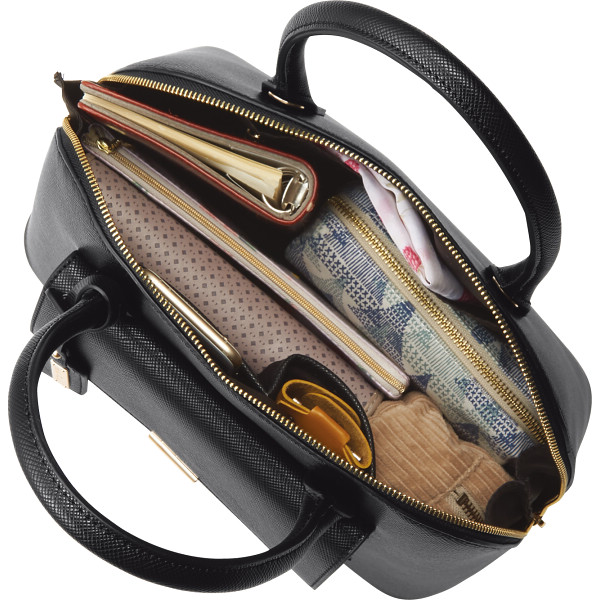 内容:(バッグ)前面=マグネット式ポケット×1・内側=ファスナーポケット×1、オープンポケット×3開閉=ファスナー式(財布)札入れ×2、ファスナー式小銭入れ×1、カード入れ×6、ポケット×1、開閉=ホック式