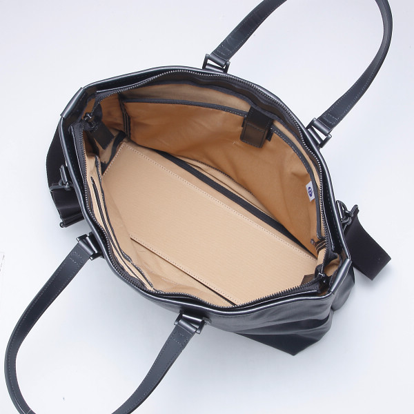 帆布にPVCコーティングを施し急な雨にも安心な耐水圧20000mm以上の素材を使用したトートバッグです。内部には小物の収納に便利なポケットが豊富です。ショルダーベルト付きですので、手提げ、ショルダーと2通りに使用できます。