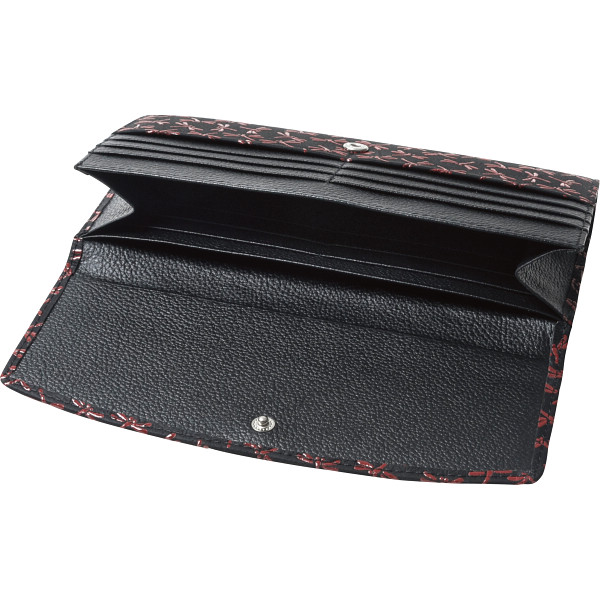 印伝(鹿革)に赤とんぼを施した意匠です。収納も多く、デザインと便利さを両立させています。