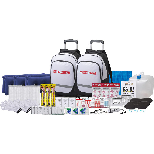 内容:LEDラジオライト(AM/FMラジオ・LEDライト・サイレン&点滅灯機能・単4電池3本使用(付属))・ブルーシート・ウォータータンク(10l)・防災ガイドブック×各1、キャリー付防災リュック×2、非常用ウェットタオル・エアークッション・ウェットティッシュ(5年保存)・静音アルミブランケット・非常用呼子笛(IDカード付き)・軍手・防災用簡易ライト・水に流せるポケットティッシュ・絆創膏/綿棒セット(絆創膏×2枚・一般医療機器製造販売届出番号:15B3X10004000001・綿棒×10本)・アイマスク・耳栓×各3、使い捨てマスク×6、携帯トイレ(1回分)×9