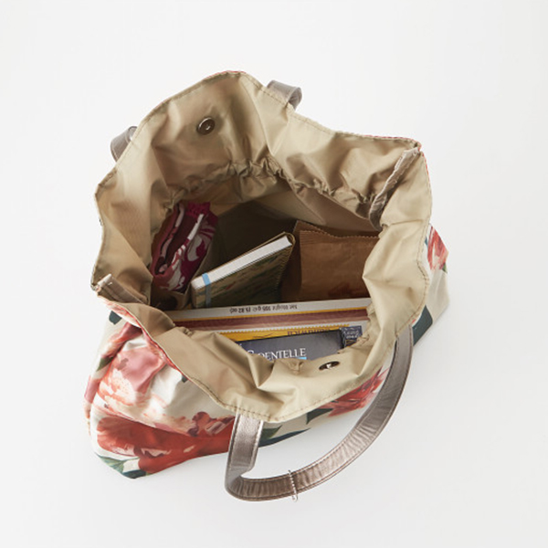 ドレスにも使われるオーガンジー生地を使用したふわりと軽いバッグです。鮮やかで美しい転写プリントは無公害で水を一切使用しない画期的な染色法で【環境にやさしいエコロジープリント】と言われております。