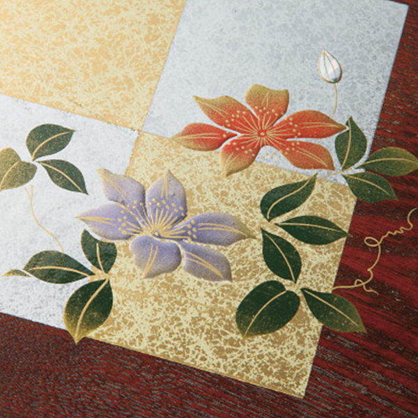 ●天然木の風合いが生かされたお盆 絵柄は山中漆器産地で蒔絵加工されています