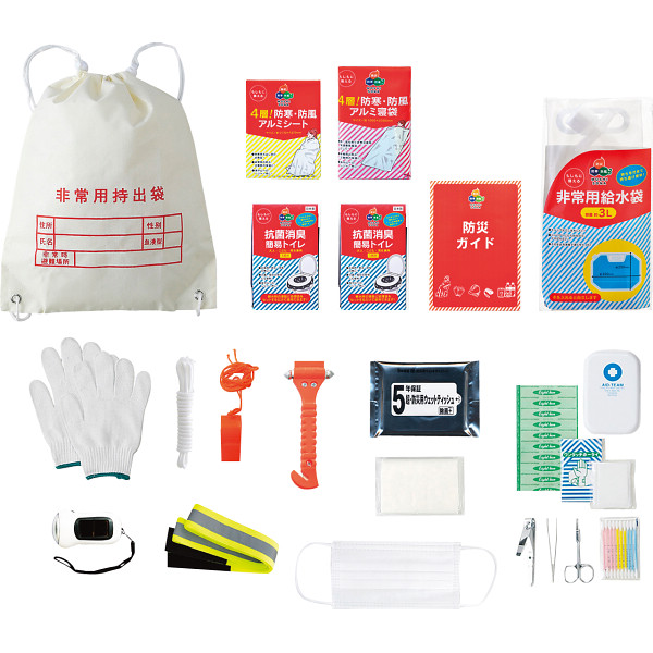 内容:両リュック・非常持出袋、4層!防寒・防風アルミシート、4層!防寒・防風アルミ寝袋、軍手、ロープ、笛、新反射安全タスキ、ソーラー&ダイナモLEDライト、抗菌消臭・簡易トイレ×2個、防災ガイド、防災用ウェットティッシュ(20枚入)、緊急脱出ハンマー、絆創膏5枚、綿棒10P、コットンパフ3枚、ワンタッチ包帯、爪切り、毛抜き、ハサミ、ポケットティッシュ、マスク1P、非常用給水袋3l