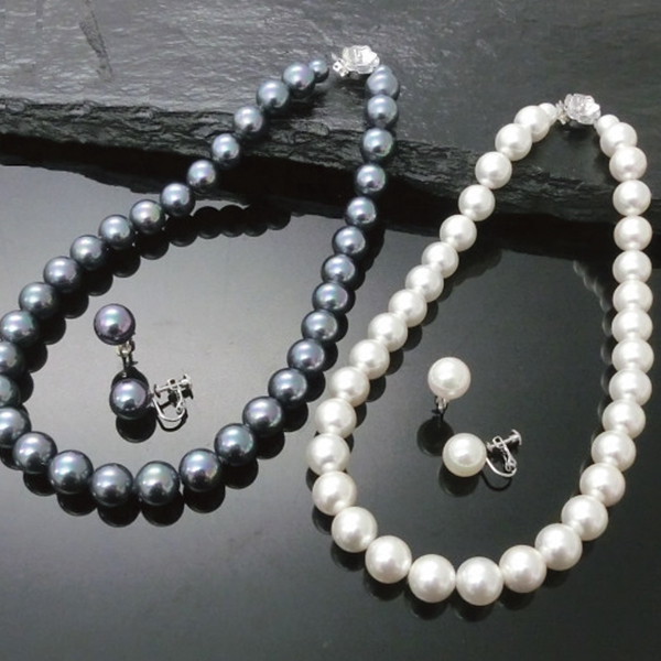 たいへん美しい大粒12mm玉の貝パールのネックレス&イヤリング2点セットです。南洋真珠で揃えるなら1本何十万円~の大きさ・美しさです。一粒一粒職人が丹念に磨き上げた手作品。留具は、花柄をイメージしたデザイン。
