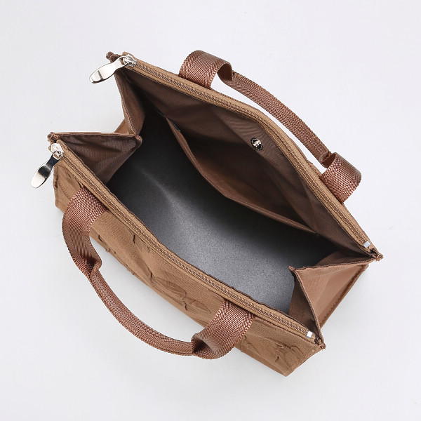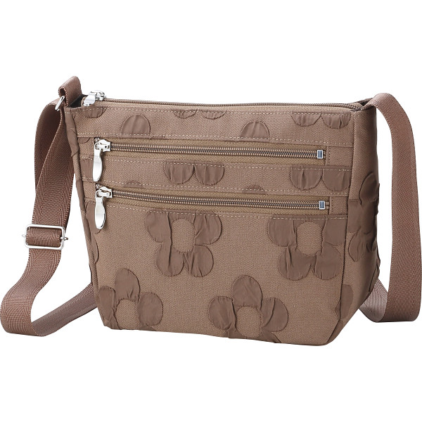 ふくれ花織は縮み方に差がある2種類の糸で生地を織って洗いにかけ、図案を浮かび上がらせます。アップリケではなく1枚の生地で花の部分だけを立体的に表現する特殊な手法で、浮かび上がった花柄は愛らしく上品な印象です。生地にこだわり、使い易い機能性を追求した日本製バッグです。