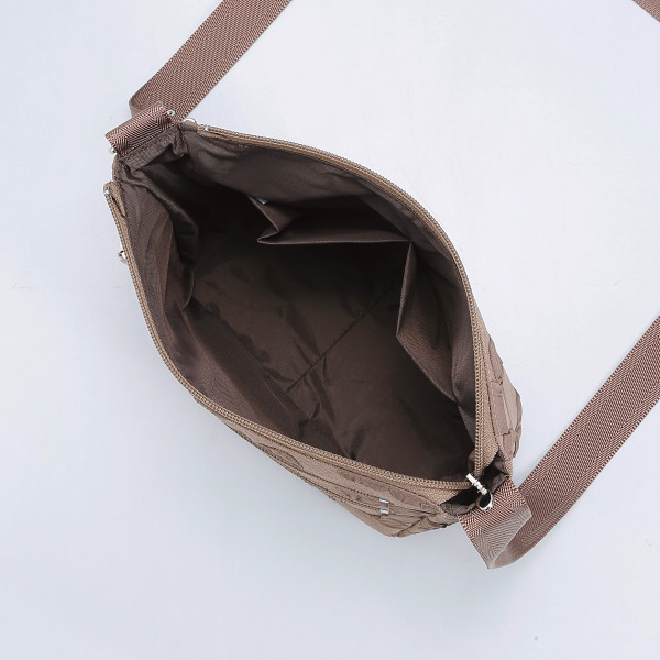 内容:(手さげ)内側=オープンポケット×1、前面・背面=天ファスナーポケット各1開閉=ホック式(ショルダー)内側=オープンポケット×2、前面=ファスナーポケット×2ショルダー着脱不可、長さ調節可開閉=ファスナー式