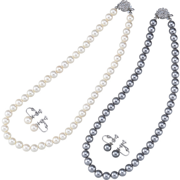 貝パールネックレスとイヤリング、それぞれホワイトとグレーの2色を揃えた合計4点のセットです。フォーマルはもちろんオフィスやカジュアルでも便利に使えます。