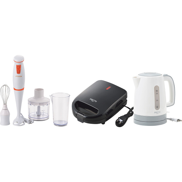 内容:(ホットサンドトースター)電源=AC100V・消費電力=400W・50/60Hz・コード長約1m、(ブレンダー)電源=AC100V・消費電力=150W・50/60Hz・コード長約1.2m、ブレンドカップ容量=約500ml、定格時間=約1分、フラッシュスイッチ(ノーマル・ターボ)、(電気ケトル)電源=AC100V・消費電力=900W・50/60Hz、コード長約75cm、容量=約1.7l