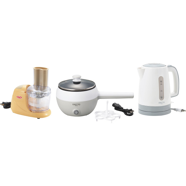 内容:(電気片手鍋)電源=AC100V・消費電力=100W・消費電力=600W、50/60Hz・コード長約1.1m・温度ヒューズ170℃・付属品=ゆでたまごラック、(電動おろし器)電源=AC100V・消費電力=80W、50/60Hzコード長約1.6m、(電気ケトル)消費電力=AC100V-900W、50/60Hzコード長約75cm・容量=約1.7l