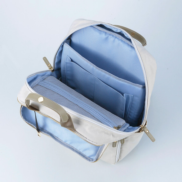 内容:前面=ファスナーポケット×3、側面=オープンポケット×2、背面=ファスナーポケット×1、内側=クッションポケット×1・オープンポケット×4・メッシュファスナーポケット×1・メッシュポケット×1