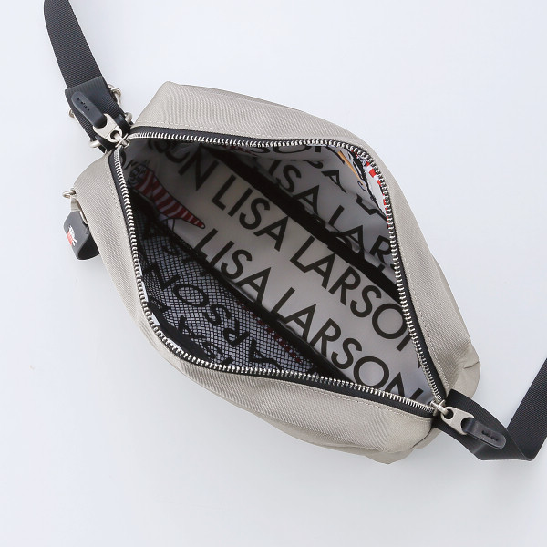背面にお財布ポケットを配したショルダーバッグ。ハンドルとショルダーベルトがそれぞれ付いているので2通りの持ち方ができます。素材にはペットボトルリサイクルのサスティナブル生地を使用し、環境にやさしいバッグに仕上げました。表のロゴタグにはさりげなくリサラーソンの人気キャラクターである“マイキー”をデザイン。またお出掛け先でも便利なエコバッグが付属します。