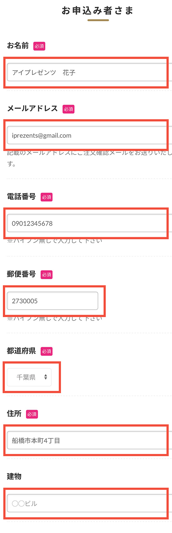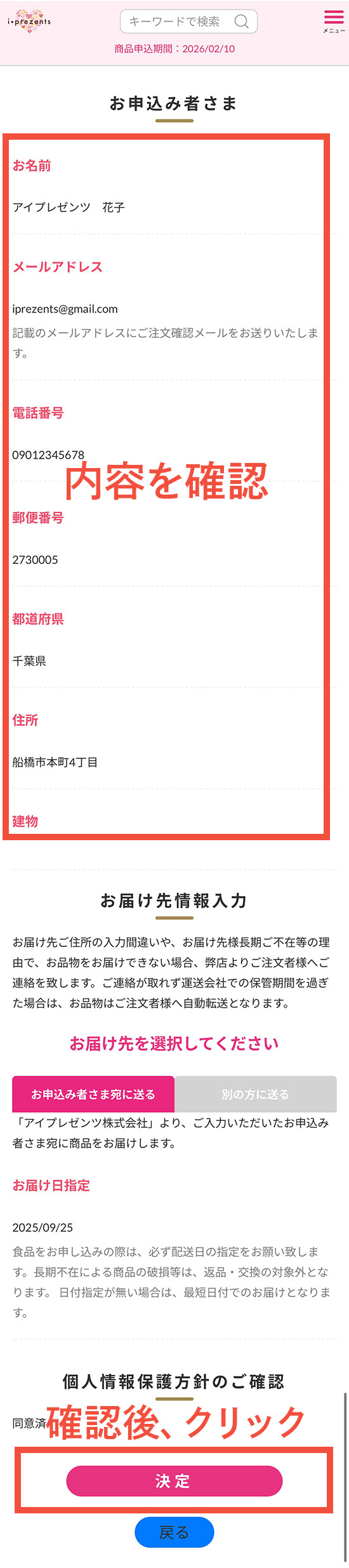 ②お届け先を入力 お届け先の氏名・郵便番号・住所・電話番号・建物名(部屋番号)を正確に入力してください(住所不備があるとお届けできない場合があります)。 日付指定ができる商品は、カレンダーから希望日を選べます。指定可否・指定できる日程は商品ごとに異なります。 別の方に送りたい場合は、「別の方に送る」を選び、送りたい方の住所を入力してください。 お申込者さま情報は必須です。宅配伝票の「送り主」はアイプレゼンツ(株)表記になります。 ![]() ![]() |